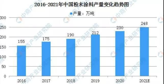 粉末涂料以環(huán)保、節(jié)能、功能性的特點在與傳統(tǒng)溶劑型涂料的市場競爭中脫穎而出,在近年來得到了快速的發(fā)展。2016年-2020年中國粉末涂料市場規(guī)模從155萬噸上升至230萬噸,增長75萬噸,增長48.4%。預(yù)計2021年中國粉末涂料產(chǎn)量將達(dá)248萬噸。