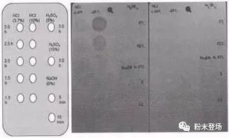 化學(xué)試劑液滴按以下濃度滴于如左圖所示的粉末涂料樣板上,達(dá)到要求的時(shí)間后(右圖所示),樣板用水沖洗干凈目測觀察試劑滴過的表面,比較鋁粉的損失。